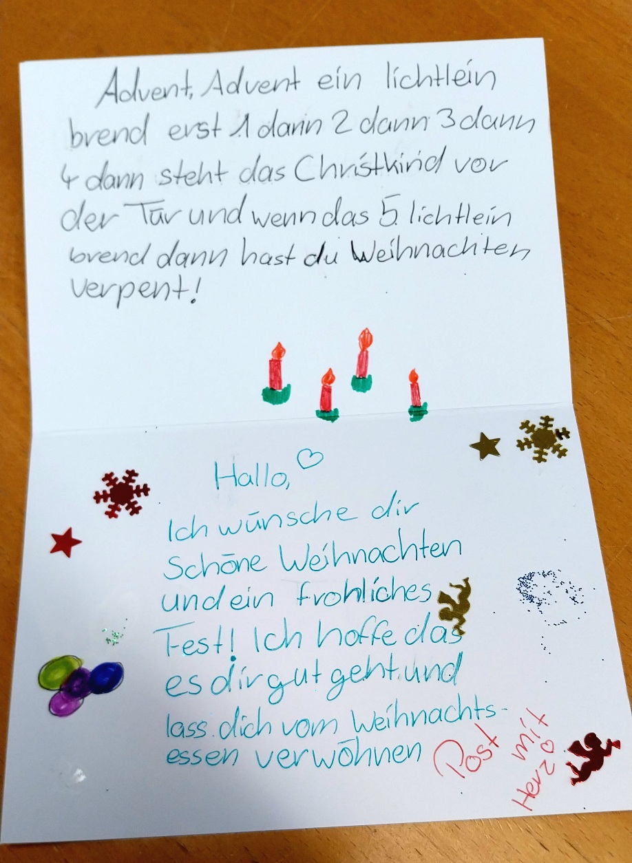 Unsere Schülerinnen und Schüler setzten sich zuvor im Unterricht intensiv mit den Themen Mitgefühl, Einsamkeit und Zusammenhalt auseinander. Mit bunten Bildern, herzlichen Worten und viel Einfühlungsvermögen entstanden so zahlreiche Karten, die nun auf die Reise gehen und hoffentlich vielen Empfängerinnen und Empfängern ein Lächeln ins Gesicht zaubern.